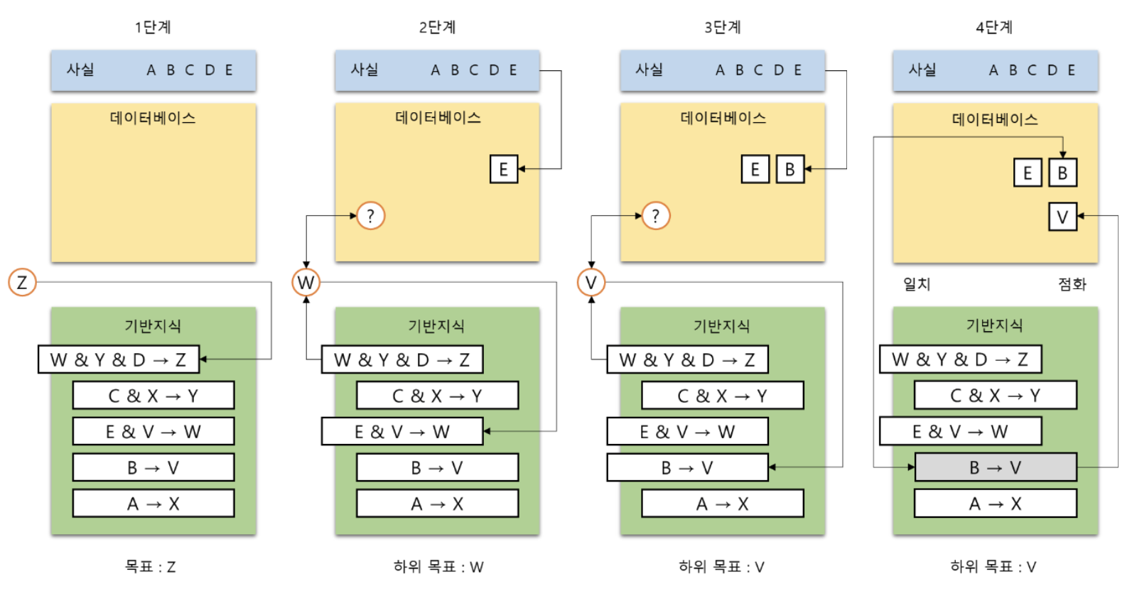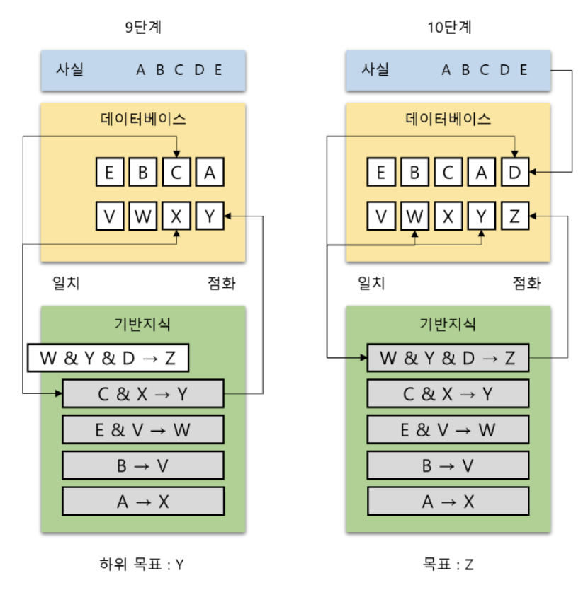 추론 과정을 스택에 들어있는 규칙, 데이터베이스의 내용과 함께 단계별로 보이시오.