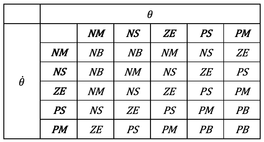 (문제 해결에 필요한 입력 𝜽, 𝜽̇과 출력 𝒇에 대한 소속함수와 퍼지 규칙은 강의 자료를 참고 할 것)