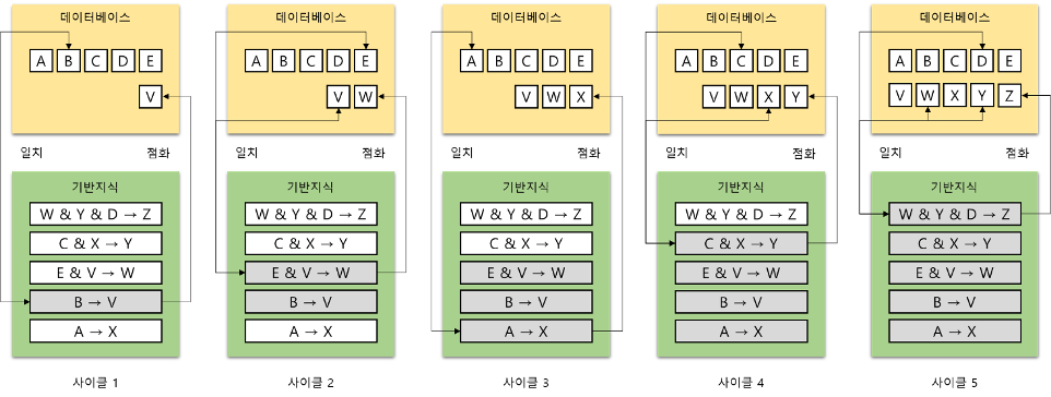 문제의 해결과정에서 활성화되는 규칙과 점화되는 규칙, 데이터베이스의 내용을 단계별로 보이시오.