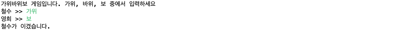 먼저 "철수 >>"를 출력하고 "가위", "바위", "보" 중 하나를 문자열로 입력받는다.