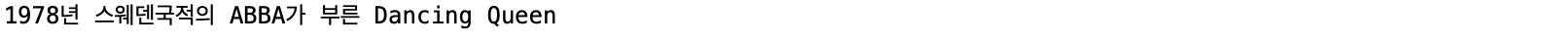 System.out.println(year + "년 " + country + "국적의 " + artist + "가 부른 " + title);