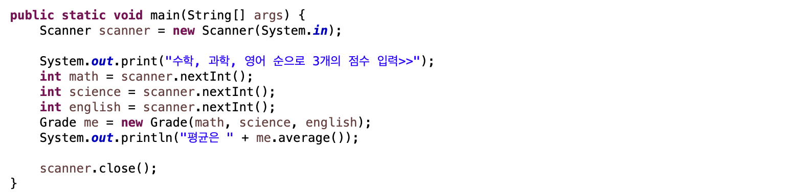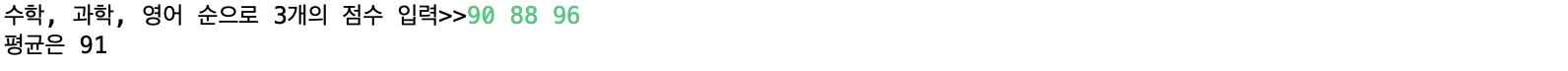 System.out.print("수학, 과학, 영어 순으로 3개의 점수 입력>>");