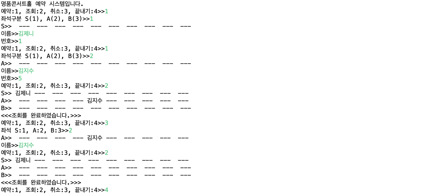 - 예약은 한 자리만 가능하고, 좌석 타입, 예약자 이름, 좌석 번호를 순서대로 입력받아 예약한다.