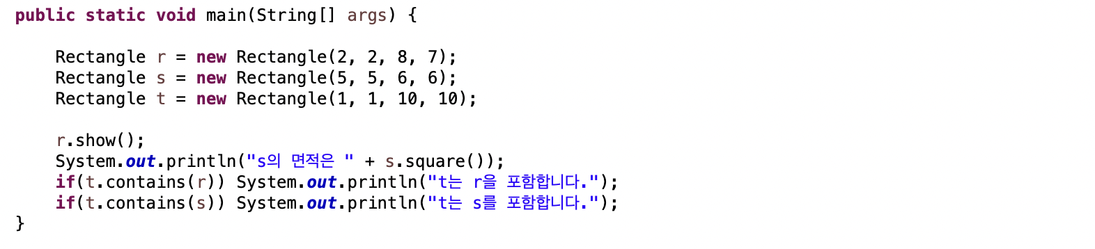 - boolean contains(Rectangle r): 매개변수로 받은 r이 현 사각형 안에 있으면 true 리턴