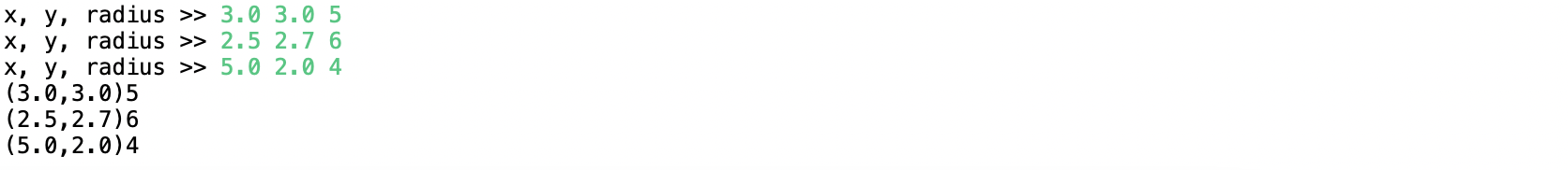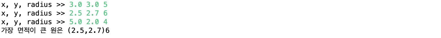 5. 다음 실행 결과와 같이 3개의 Circle 객체 배열을 만들고 x, y, radius 값을 읽어 3개의 Circle 객체를 만들고