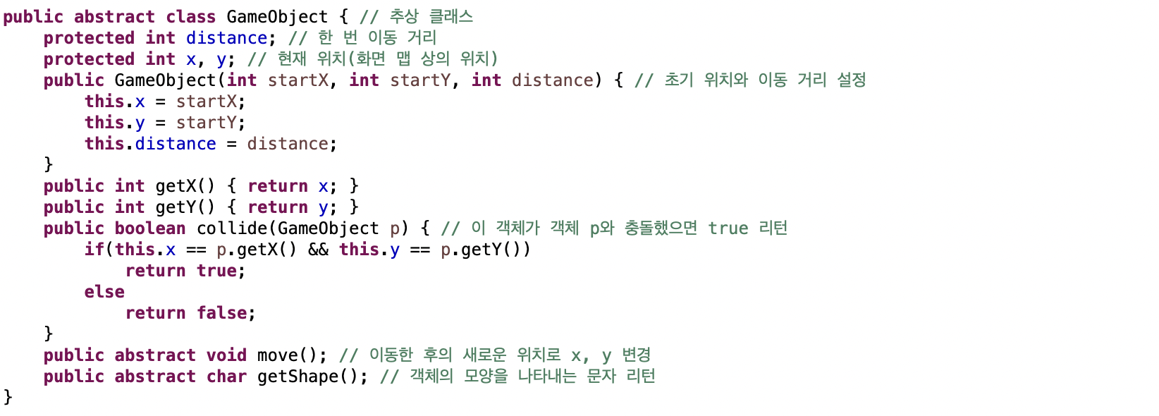 각 객체의 모양을 정의하는 getShape( )을 추상 메소드로 가진 추상 클래스 GameObject이다.