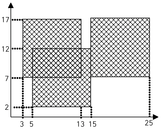 예를 들어 흰색 도화지 위에 세 장의 검은색 색종이를 그림과 같은 모양으로 붙였다면 검은색 영역의 넓이는 260이 된다.